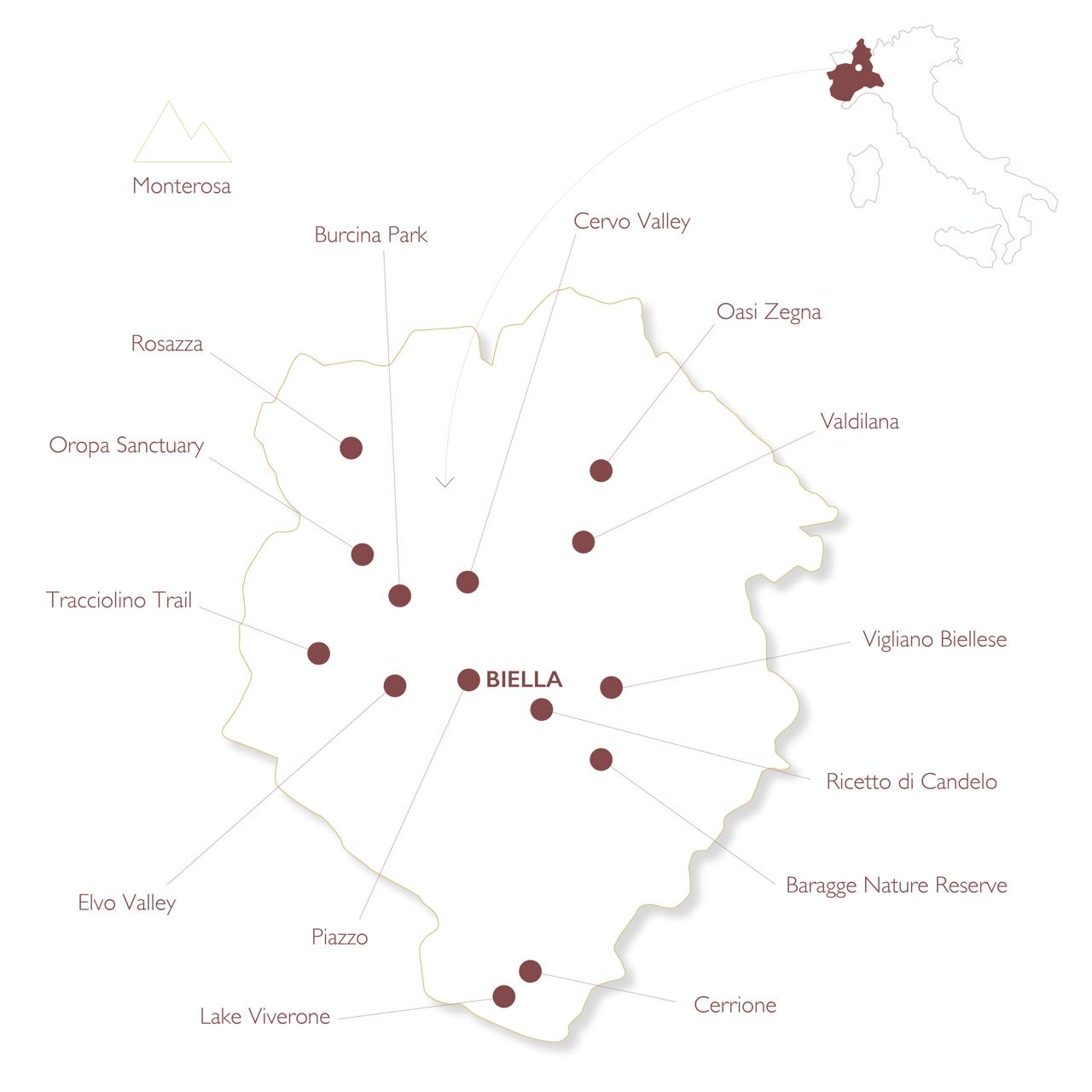 Whether you’re addicted to sport or longing for peace and quiet, this area will satisfy your needs (Questa te l’avevo messa per sbaglio nel testo di prima, ma va qui). You can enjoy unique experiences in well conserved nature; drive along little known roads, such as the “Tracciolino” panoramic road straddling the Biellese Prealps and the Po valley plains; explore the many alpine sanctuaries, such as the famous Santuario di Oropa, whose “Sacred Mount” was granted UNESCO heritage status in 2003; visit hauntingly beautiful castles and country houses; stay in enchanting resorts and discover the sumptuous local food & wine heritage!